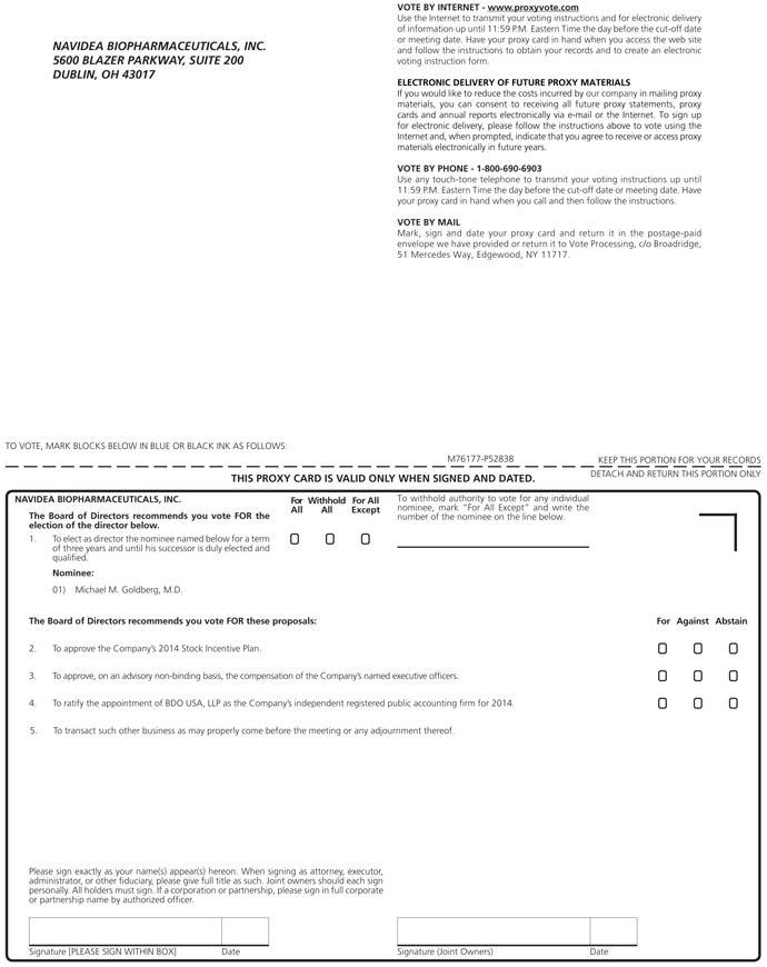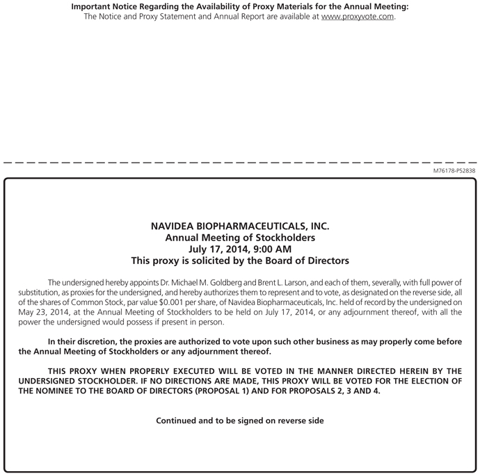 The Annual Meeting of the Stockholders of Navidea Biopharmaceuticals, Inc., a Delaware corporation (the Company), will be held at The Conference Center at OCLC, 6600 Kilgour Place, Dublin, Ohio 43017, on July 17, 2014, at 9:00 a.m., Eastern Daylight Time, for the following purposes: